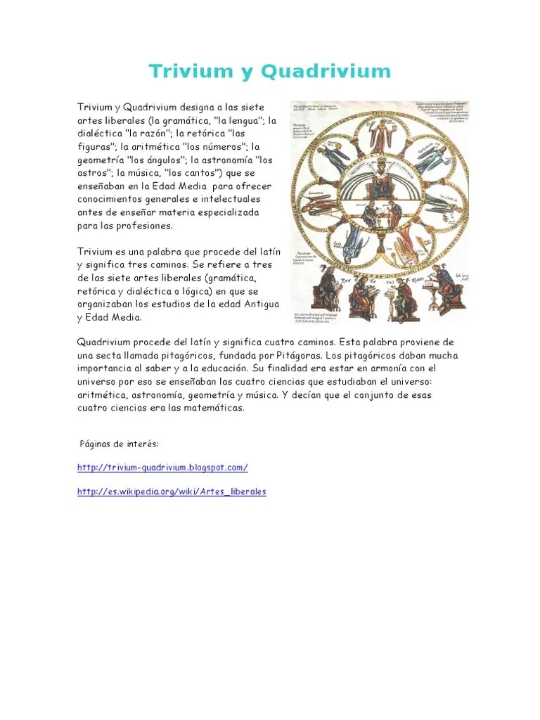 En la edad media se había dividido la enseñanza de las escuelas en dos grandes secciones: Eran en conjunto los rudimentos de las ciencias que los aspirantes a. El término artes liberales designaba los estudios que tenían como propósito ofrecer conocimientos generales y… En las universidades medievales trivium combinado con el quadrivium comprendía las siete artes liberales. Una de las intenciones claves detrás de aplicar el trivium y quadrivium es distinguir entre la realidad y la ficción. Este método de enseñanza se basa en un plan de estudios esbozado por platón.